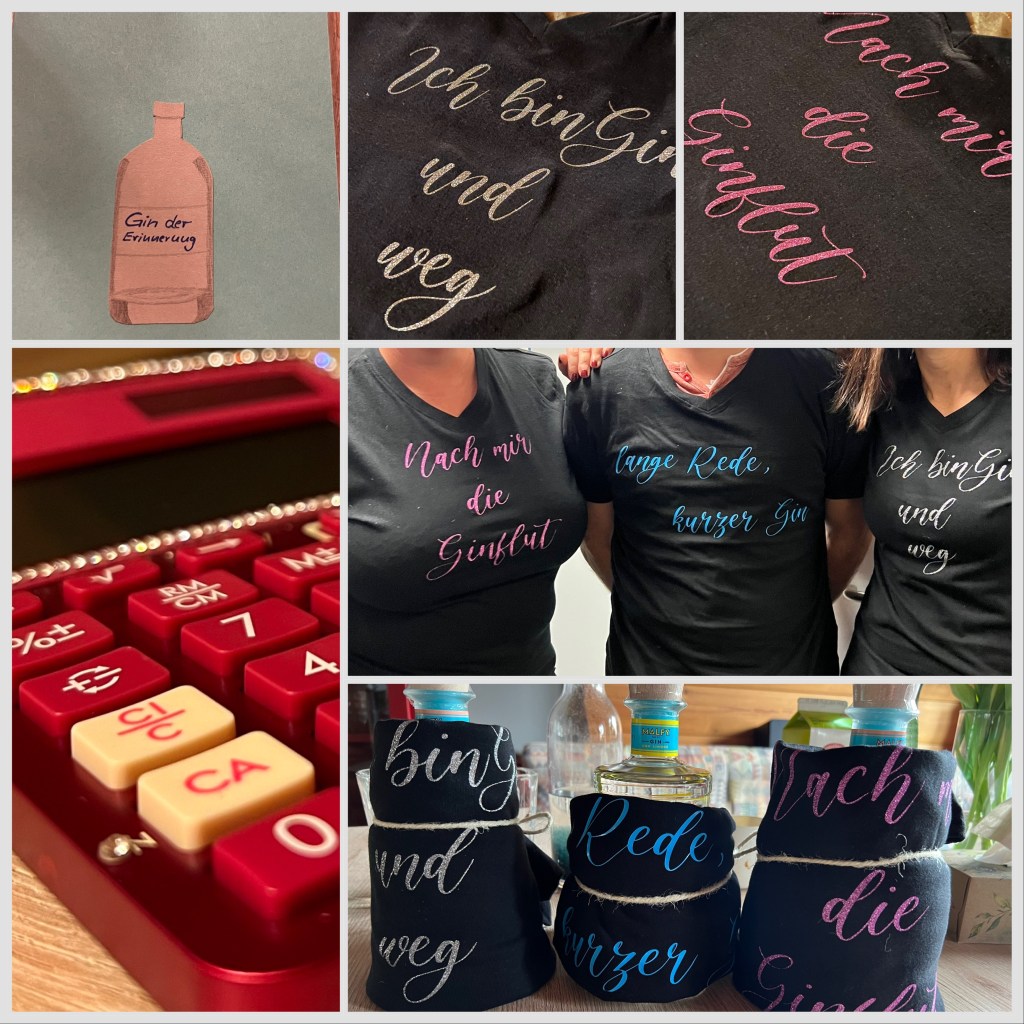 Knallige Glitzertaschenrechner und funkelnde Statement Shirts. Passend dazu Gin und ein Gutschein für einen Gin Workshop.